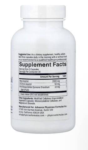 Инозитол — это полиол (сахарный спирт), который естественным образом вырабатывается в организме печенью и почками. Его также можно найти в таких продуктах, как фрукты, бобы, зерновые и орехи. Соотношение мио-инозитола и D-хиро-инозитола 40:1 считается предпочтительной формой инозитола. Пирролохинолинхинон (PQQ), также называемый метоксатином, является окислительно-восстановительным кофактором и антиоксидантом.