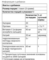 Витамин C (в виде аскорбата кальция), натрий, пептиды гидролизованного морского коллагена, гиалуроновая кислота (в виде гиалуроната натрия).