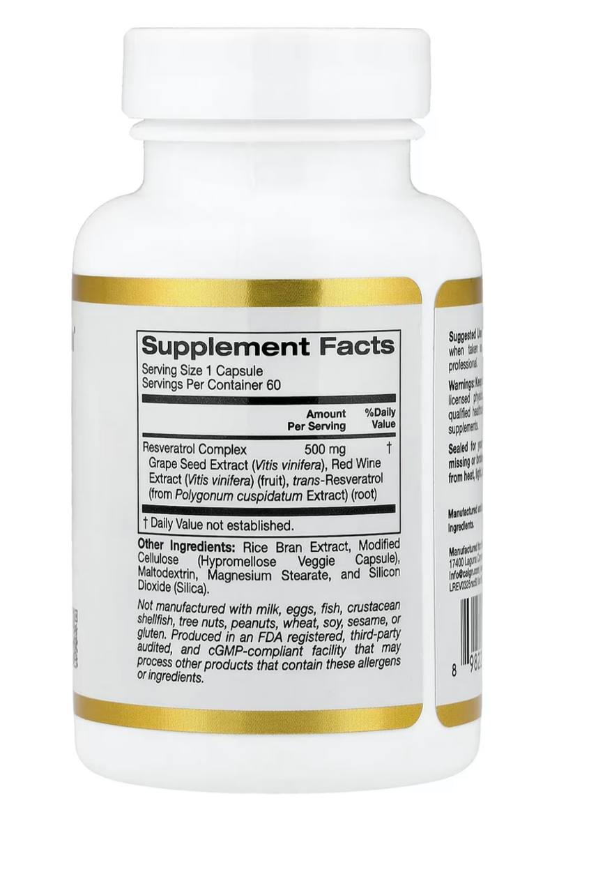 Комплекс с ресвератролом от California Gold Nutrition®содержит смесь транс-ресвератрола, экстракта виноградных косточек и экстракта красного вина, которые помогают поддерживать здоровье сердечно-сосудистой системы и клеток*.