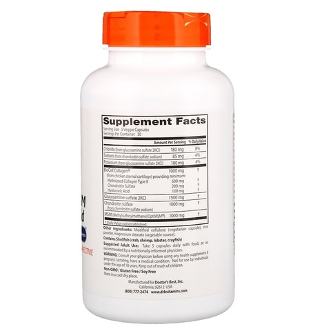 Препарат «Глюкозамин, хондроитин, MSM® и гиалуроновая кислота» от Doctor's Best обеспечивает организм четырьмя важными питательными веществами, которые помогают поддерживать здоровье суставов и соединительных тканей: глюкозамином, хондроитином, метилсульфонилметаном (МСМ, из OptiMSM) и гиалуроновой кислотой (BioCell Collagen). Сульфат глюкозамина помогает улучшить смазку суставов, повышая их подвижность и гибкость. Хрящи, сформированные из протеогликанов, в основном располагаются на костях и рядом с суставами и состоят преимущественно из протеина коллагена с боковыми цепями, которые называются хондроитина сульфатом. МСМ снабжает организм биодоступной серой, которая необходима для здоровья суставов. Коллаген BioCell Collagen — доказавший свою эффективность диетический ингредиент, в котором содержится патентованная смесь гидролизованного коллагена типа II природного происхождения, хондроитина сульфата и гиалуроновой кислоты в хорошо усваиваемой форме.