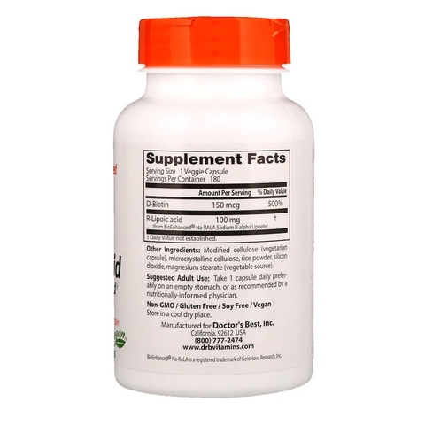 Стабилизированная R-липоевая кислота производства компании Doctor's Best содержит BioEnhanced® Na-RALA, натриевую соль R-липоевой кислоты (RLA). BioEnhanced® Na-RALA находится в своей естественной стабилизированной форме RLA, которая не разлагается при высоких температурах, является более биодоступной и биологически активной. Липоевая кислота играет важную роль в метаболизме глюкозы и выработке энергии. Липоевая кислота является одновременно жиро- и водорастворимой. Исследования показали, что липоевая кислота может поддерживать антиоксидантную защиту организма. D-биотин является неотъемлемой частью ферментативных процессов, необходимых для расщепления и превращения жирных кислот и углеводов в энергию.