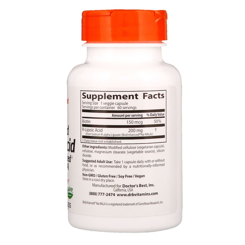 Стабилизированная R-липоевая кислота производства компании Doctor's Best содержит BioEnhanced® Na-RALA, натриевую соль R-липоевой кислоты (RLA). В отличие от обычной RLA, BioEnhanced® Na-RALA представляет собой стабилизированную форму RLA, которая не разлагается при высоких температурах и является более биодоступной, чем обычная RLA. При создании этой RLA применяется метод экстракции, предотвращающий попадание в препарат остатков растворителя.