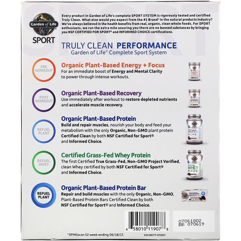 Every product in Garden of Life's complete Sport System is rigorously tested and certified Truly Clean. What else would you expect from the #1 Brand¹ in the natural products industry? We've always believed in the health benefits from real, organic clean whole foods. For Sport enthusiasts, we run the extra mile assuring you there are no banned substances by bringing you NSF Certified for Sport and Informed Choice certifications.