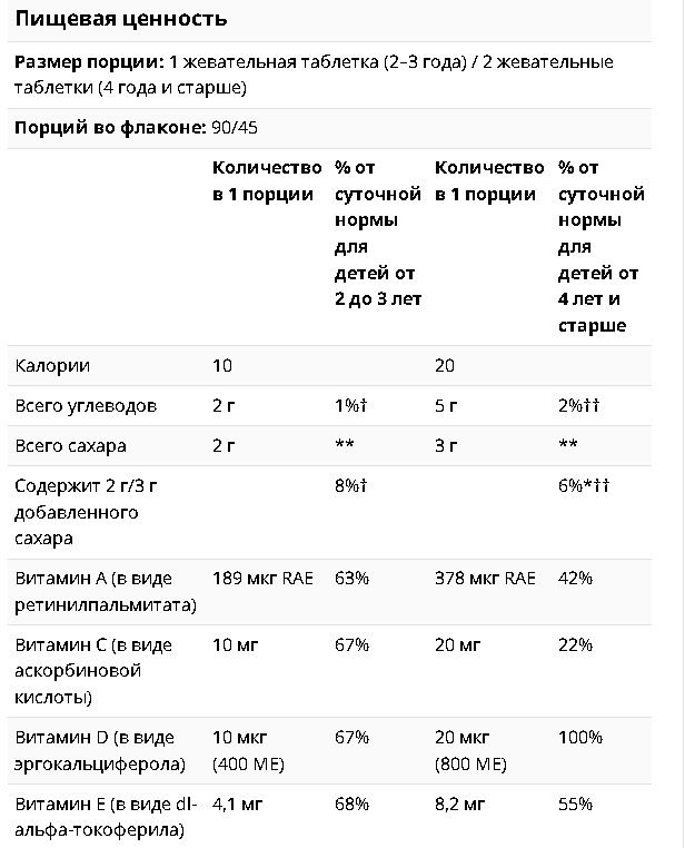 Можно давать детям от двух до трех лет по одной (1) жевательной таблетке в день. Можно давать детям от четырех лет и старше по две (2) жевательных таблетки в день. Попросите ребенка тщательно пережевать каждую таблетку.