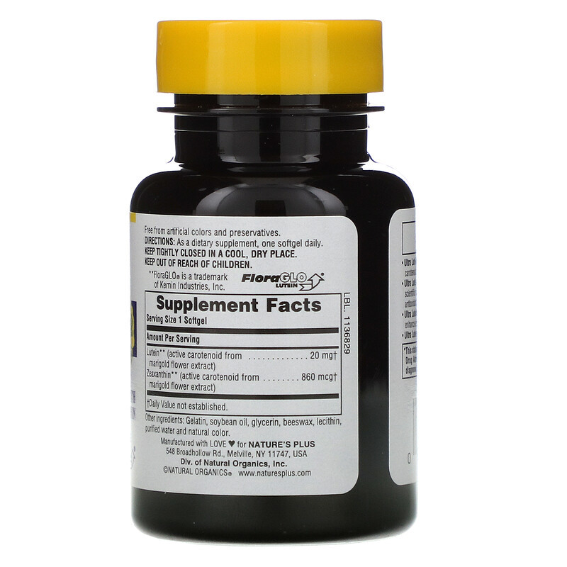 Nature's Plus представляет непревзойденную питательную поддержку для здоровья глаз: Ultra Lutein максимальной силы. Активные ингредиенты Ultra Lutein лютеин и зеаксантин совместно образуют антиоксидантную защиту, помогающую укрепить здоровье глаз. Содержащийся в Ultra Lutein лютеин FloraGLO представляет собой активный каротиноид из концентрированного экстракта календулы, созданного путем эксклюзивного патентованного процесса очистки. Хотя лютеин содержится во множестве распространенных продуктов, большинство взрослых не получают его достаточное количество из обычного рациона. Научные исследования показывают, что 20 мг лютеина — минимально необходимое количество для эффективной поддержки здоровья глаз у взрослых. Каждая мягкая желатиновая капсула Ultra Lutein содержит в точности 20 мг лютеина FloraGLO. Ultra Lutein дополнительно содержит кофактор зеаксантин, который также выводится из календулы и синергетически дополняет натуральные антиоксидантные свойства лютеина.