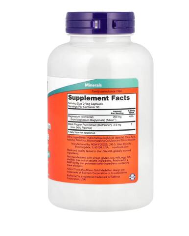 В добавке с глицинатом магния используется магний, связанный с аминокислотой глицином, что облегчает усвоение в кишечнике. Магний — это минерал, имеющий важное значение для производства энергии и обмена веществ, сокращения мышц, передачи нервных импульсов и минерализации костей. Он необходим для корректного функционирования около 300 ферментов. К процессам, требующим магния, относится производство жиров и белков, а также метаболизм глюкозы. Поддержание нормального уровня магния в организме важно для кальциевого обмена, так как он участвует в работе паращитовидной железы. Этот продукт содержит BioPerine® — запатентованный экстракт чёрного перца.
