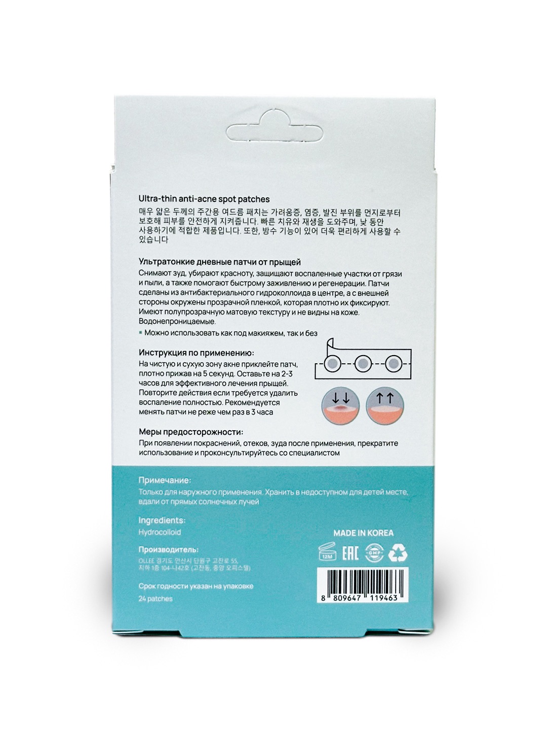 Применение: Нанесите на чистую и сухую кожу, плотно прижав на 5 секунд. Оставьте на 2-3 часа. Рекомендуется менять патчи не реже чем раз в 3 часа.