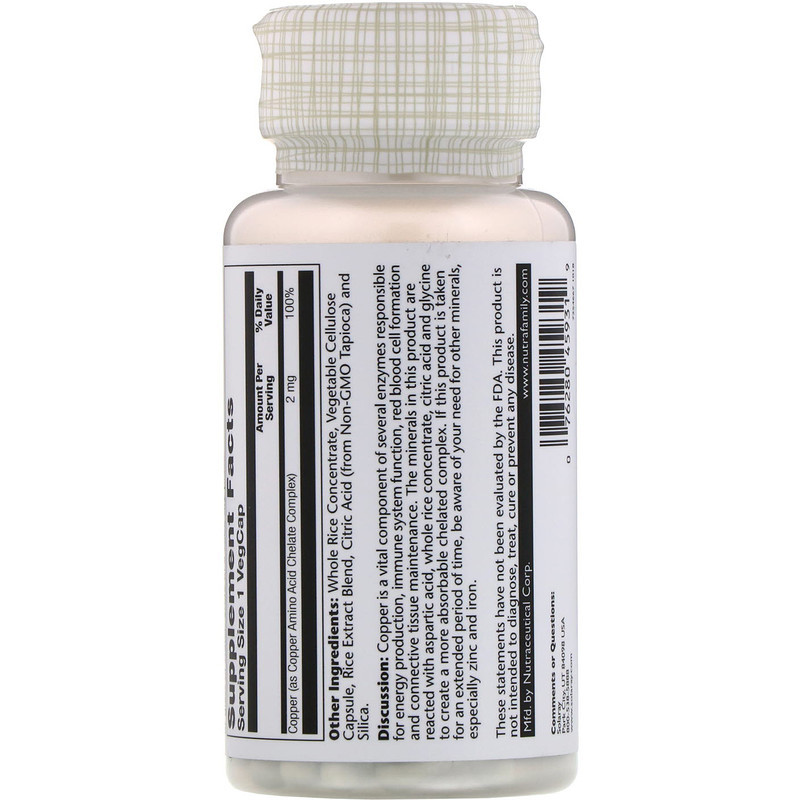 Комментарий. Медь — важный элемент нескольких ферментов, которые отвечают за выработку энергии, работу иммунной системы, формирование красных кровяных телец и поддержание соединительной ткани. В этом продукте минералы вступают в реакцию с аспарагиновой кислотой, концентратом из цельного риса, лимонной кислотой и глицином. В результате образуется хелатный комплекс с более высокой усвояемостью. При длительном приеме данного продукта необходимо помнить о потребности в других минералах, особенно в цинке и железе.