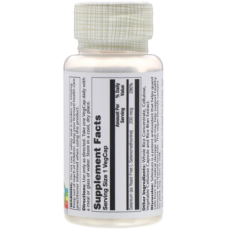 Описание. Селен является мощным антиоксидантом, защищающим клетки от повреждения свободными радикалами, и может оказывать поддержку иммунной системы и функции щитовидной железы. Растительная формула не содержит дрожжей, сои, кукурузы и молока.