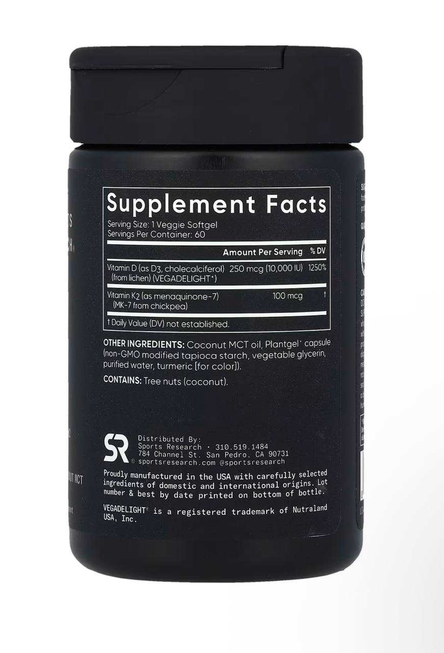 Укрепите свои кости и иммунную систему с помощью одного-единственного витамина D3 + K2 от Sports Research®. Эта подходящая для веганов формула сочетает в себе VegaDELight ™ Vegan D3 из лишайников, K2 из нута и кокосовое масло MCT в сертифицированной веганской капсуле PlantGel ™, чтобы дополнить ежедневное потребление незаменимых микронутриентов D и K. Стремясь всегда предоставлять продукты высочайшего качества, мы также добавили порошок куркумы во внешнюю оболочку мягкого геля, чтобы защитить активные ингредиенты внутри от фотодеградации, которая может произойти под воздействием ультрафиолета.